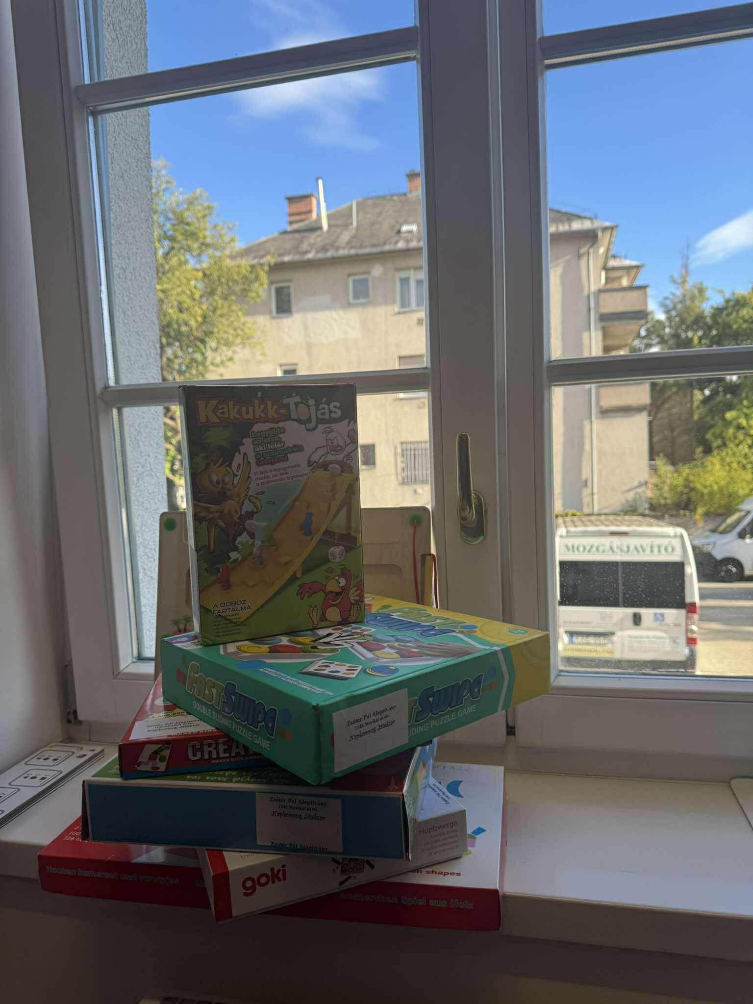 Nagy örömünkre ismét felajánlást kaptunk a kölcsönző részére. A képen látható játékokat, Dr. Hajdu Annától, iskolánk egyik diákjának édesanyjától kaptuk, aki már korábban is ajándékozott társasjátékokat.